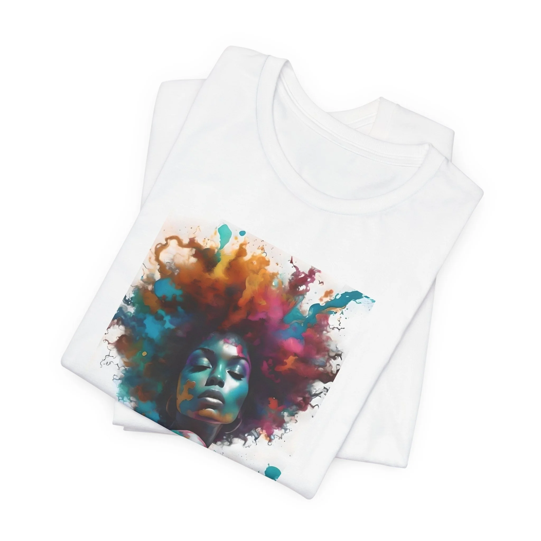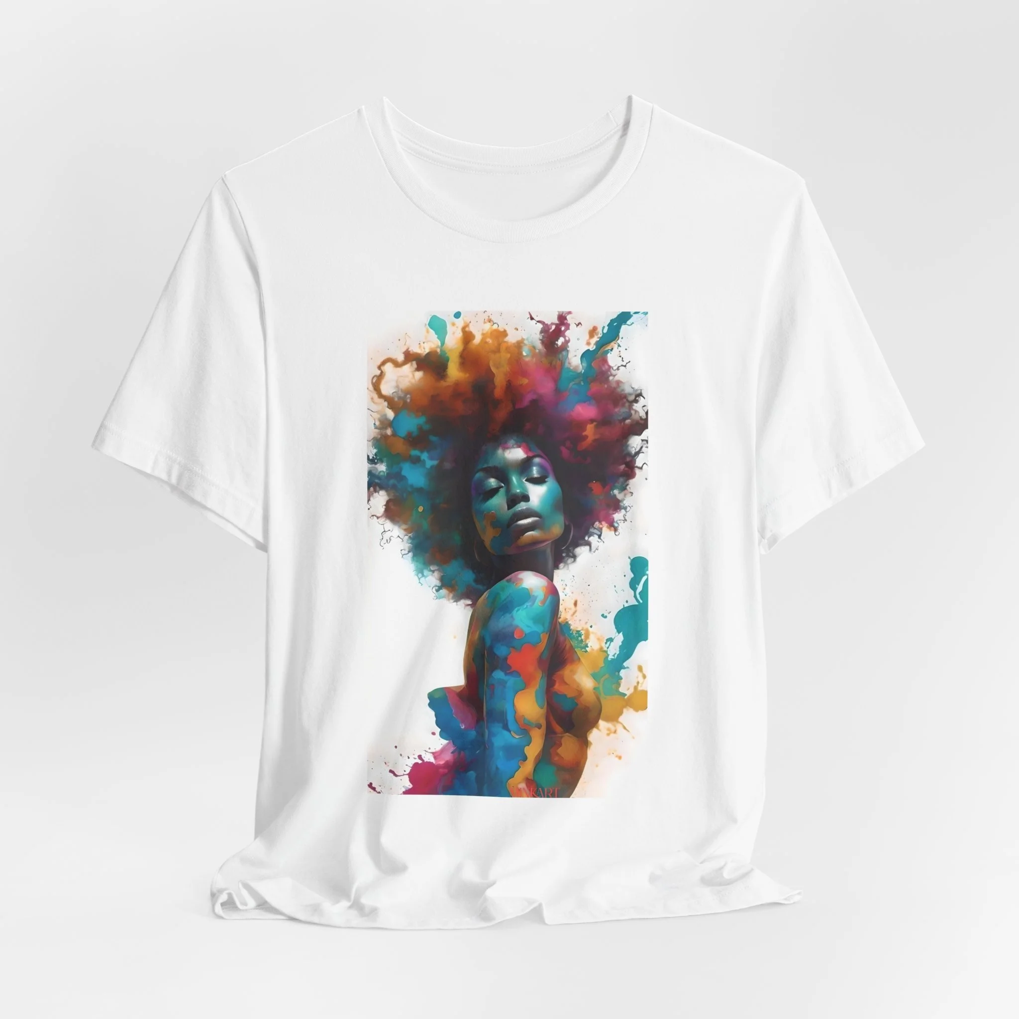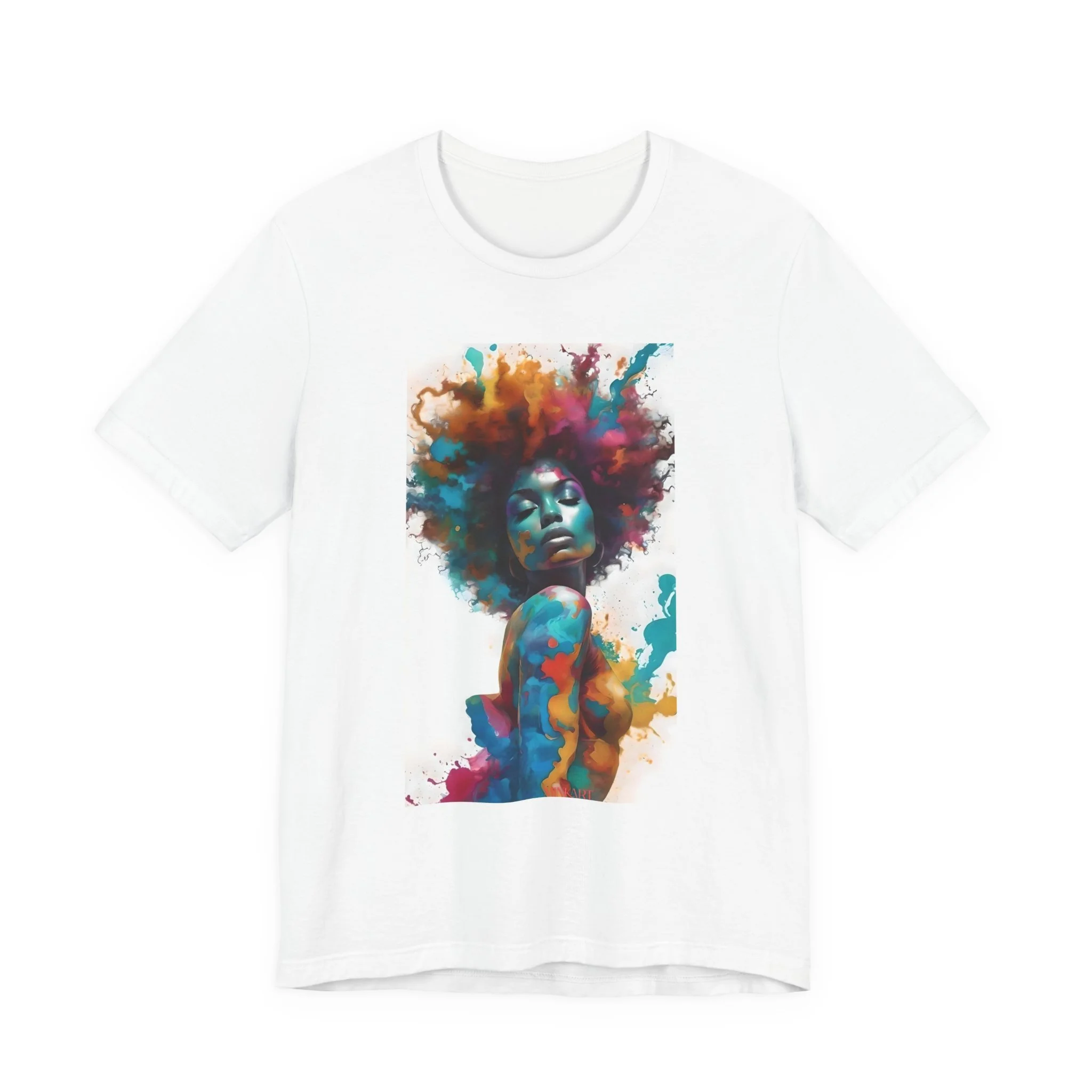 A lightweight, art-forward tee that feels like wearable painting. The soft, breathable cotton lies close to the skin while the bold watercolor portrait across the chest brings confident color to everyday outfits. It moves easily from streetwear to gallery nights, layering under jackets or standing alone as the focal piece. The crew neckline and retail fit keep the silhouette clean and modern; the tear-away label and side seams add comfort and durability. This shirt speaks to people who celebrate bold self-expression and want clothing that feels thoughtful, effortless, and made to last.